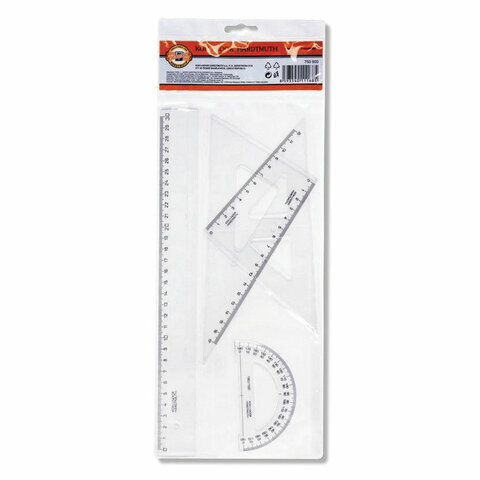 В средний чертежный набор KOH-I-NOOR входят: линейка со шкалой 30 см; угольник с углами 30/60/90° и шкалой 17 см; угольник с углами 45/45/90° и шкалой 12 см; транспортир 180/100°.Геометрический набор KOH-I-NOOR включает все, что необходимо школьнику.