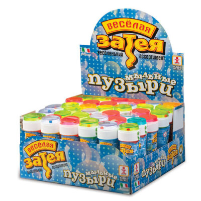 Флакон со специальным мыльным раствором. Крышка флакона снабжена аппликатором для запуска пузырей. Мыльные пузыри легко надуваются, обладают приятным запахом, нетоксичны.