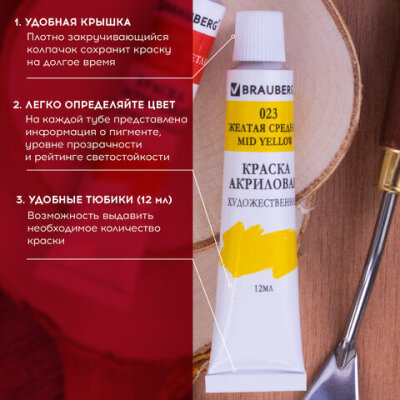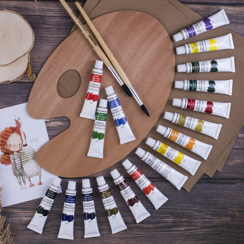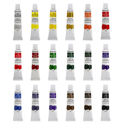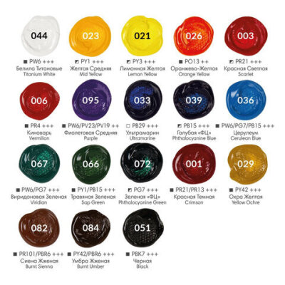 | Цвет | белила титановые (044), виридоновый зеленый (067), голубой ФЦ (039), желтая средняя (023), зеленый ФЦ (072), киноварь (006), красная светлая (003), красная темная (001), лимонная желтая (021), оранжево-желтый (026), охра желтая (029), сиена жженая (082), травяной зеленый (066), ультрамарин (033), умбра жженая (084), фиолетовый средний (095), церулеум (036), черный (051) |