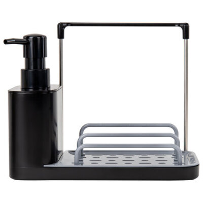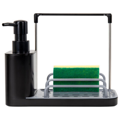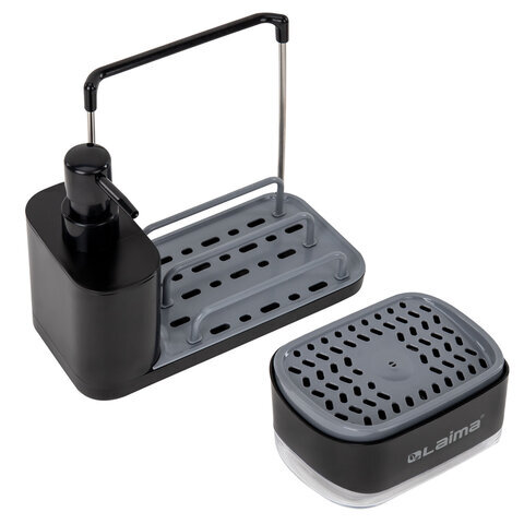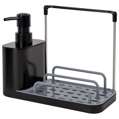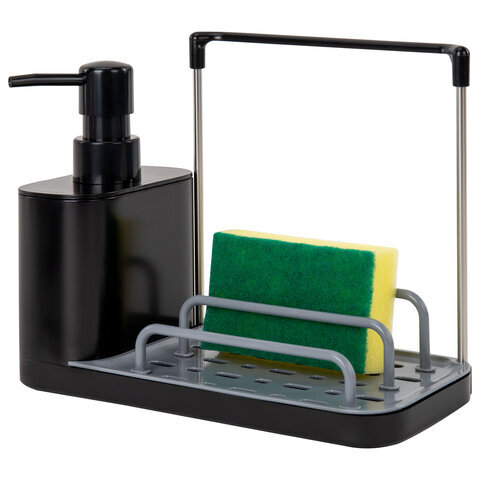 Диспенсер/дозатор DUET+ для мыла и моющего средства + губка, с держателем для тряпки, ЧЕРНЫЙ, 11х22х12 см, LAIMA HOME, 700046