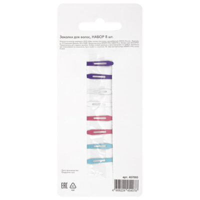 Заколки для волос НАБОР 8 шт., 3 см, клик-клак, глянцевый, разные цвета, MONTE VITA (МОНТЕ ВИТА), 457093