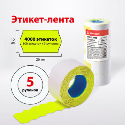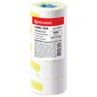 Этикет-лента 26х12 мм, волна, желтая, комплект 5 рулонов по 800 шт., BRAUBERG, 123577