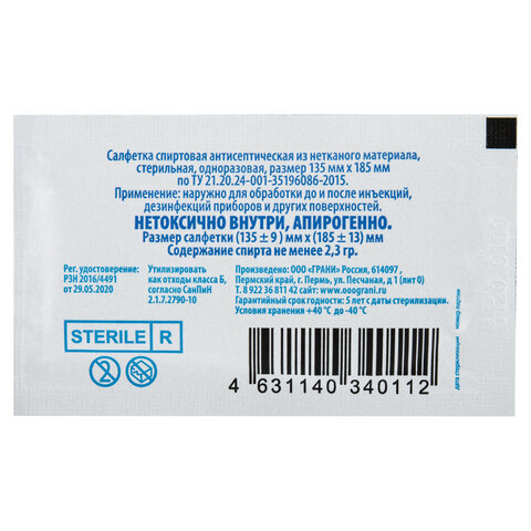 | Вид пропитки | 70% этиловый спирт |