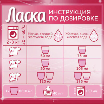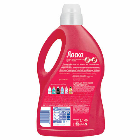 Ласка «Восстановление цвета» благодаря специально разработанной системе защиты цвета, сохраняет структуру ткани восстанавливает яркость и интенсивность цвета даже после частых стирок. Предохраняет от выцветания. Для ручной и автоматической стирки.