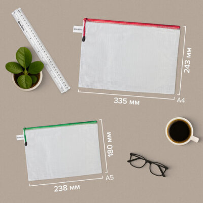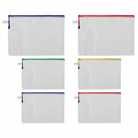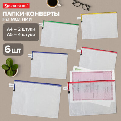 Папка-конверт СУПЕР КОМПЛЕКТ на молнии ПЛОТНЫЕ, 6 шт. (А4 - 2 шт., А5 - 4 шт.), сетчатая, BRAUBERG, 271347