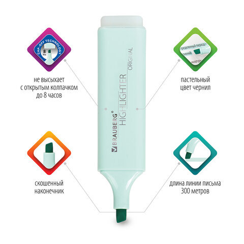 • Текстовыделитель BRAUBERG "ORIGINAL PASTEL" предназначен для выделения текста на бумаге любого типа, включая факс-бумагу.