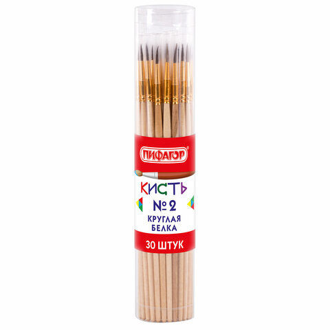 Кисть ПИФАГОР, БЕЛКА, круглая, № 2, деревянная лакированная ручка, с колпачком, 200816