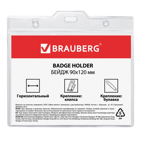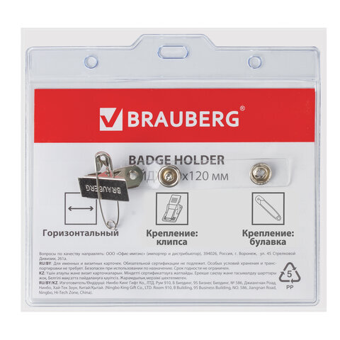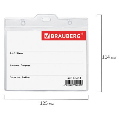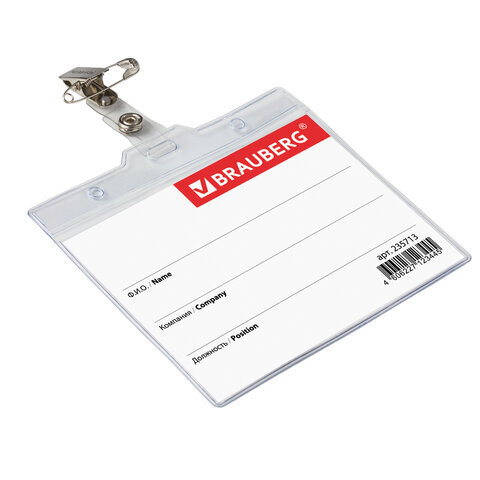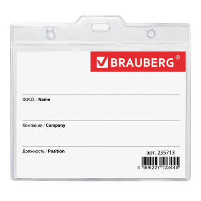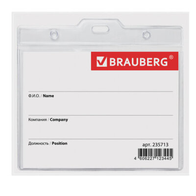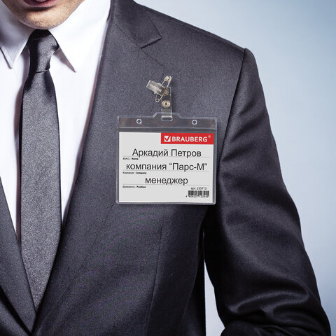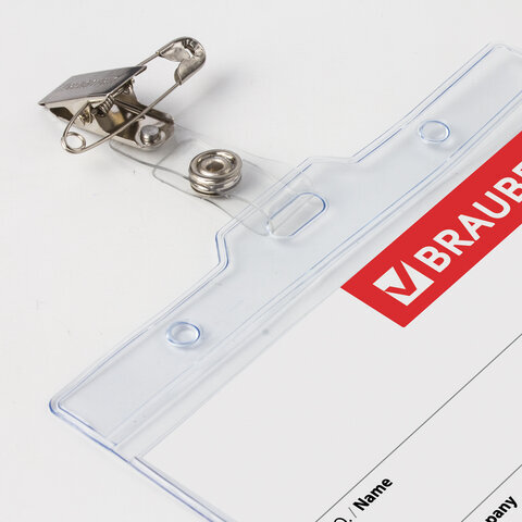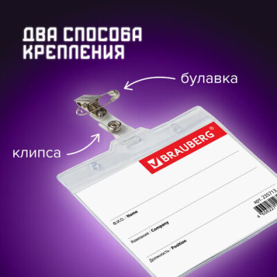 Горизонтальный БОЛЬШОЙ бейдж BRAUBERG с клипсой и булавкой для именной карточки предназначен для идентификации сотрудников в компаниях, а также на семинарах, тренингах, презентациях и других мероприятиях.