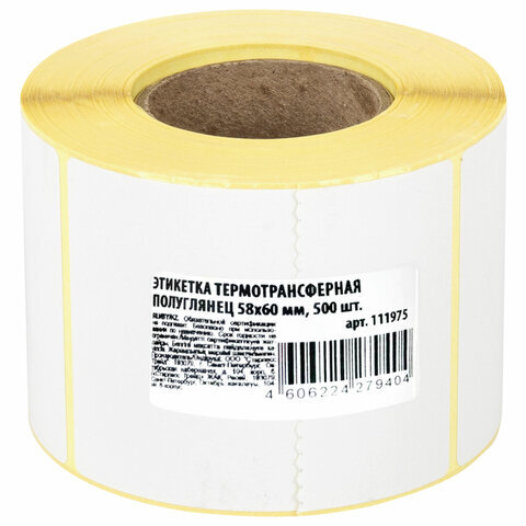 Этикетки термотрансферные, ПОЛУГЛЯНЕЦ, 58х60 мм, 500 этикеток в ролике, 111975