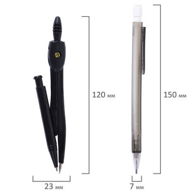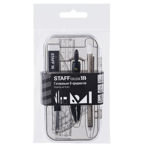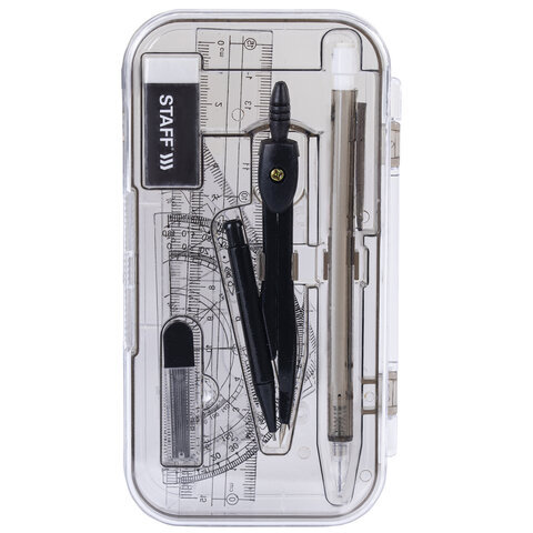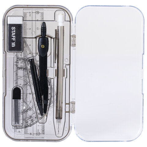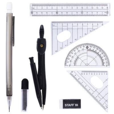 | Комплектация | линейка, механический карандаш, пенал пластиковый, пенал с запасным грифелем, стирательная резинка, транспортир, треугольник 30°60°, треугольник 45°, циркуль |