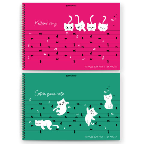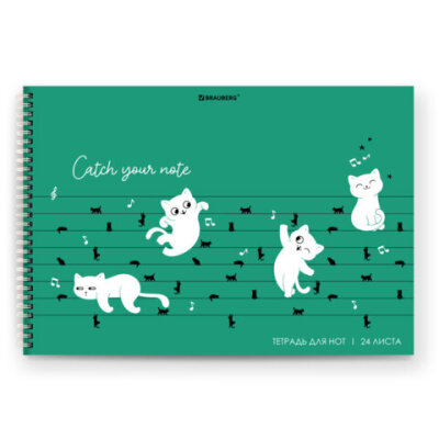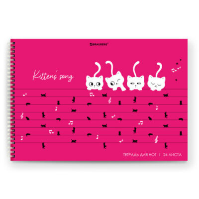 Тетрадь для нот А4, 24 л, обложка мелованный картон, горизонтальная, на гребне, BRAUBERG, "Котики", 404641