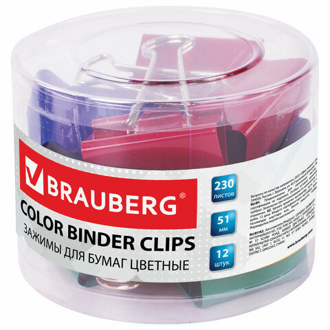 Зажимы для бумаг BRAUBERG, КОМПЛЕКТ 12 шт., 51 мм, на 230 листов, цветные, в пластиковом цилиндре, 221131