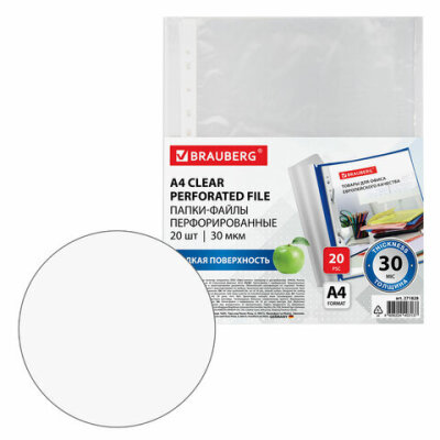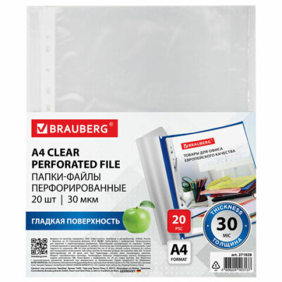 Папки-файлы перфорированные А4 BRAUBERG, КОМПЛЕКТ 20 шт., гладкие, 30 мкм, 271828