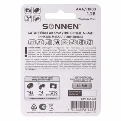 Батарейки аккумуляторные Ni-Mh мизинчиковые КОМПЛЕКТ 2 шт., AAA (HR03) 650 mAh, SONNEN, 454236