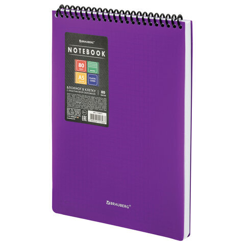 Блокнот А5 80 л., спираль пластиковая, обложка пластик, клетка, BRAUBERG "Metropolis", ФИОЛЕТОВЫЙ, 115571