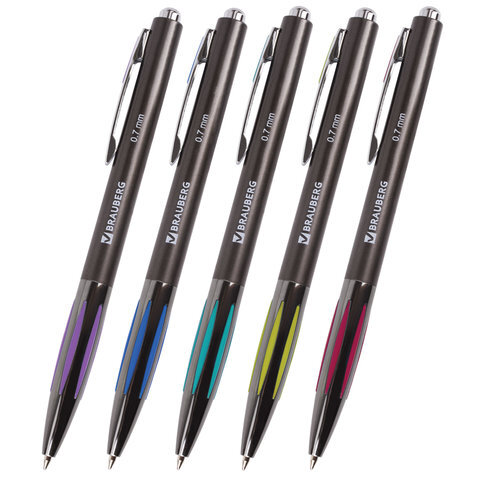 Ручка шариковая автоматическая BRAUBERG "Stripe", СИНЯЯ, корпус ассорти, узел 0,7 мм, линия письма 0,35 мм, 141876