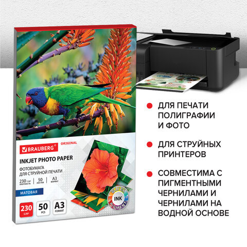 Фотобумага матовая БОЛЬШОГО ФОРМАТА, А3, 230 г/м2, односторонняя, 50 листов, BRAUBERG ORIGINAL, 363997