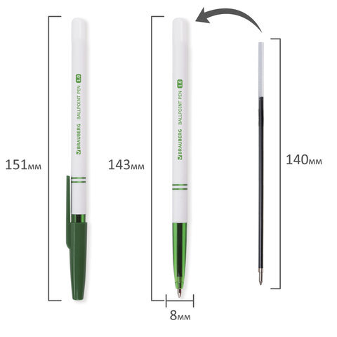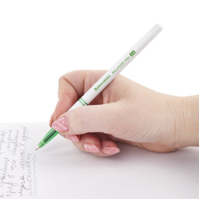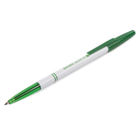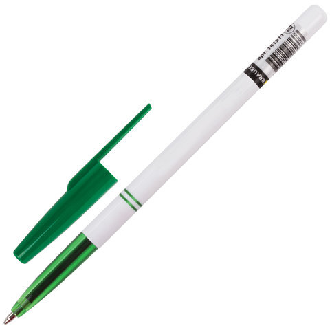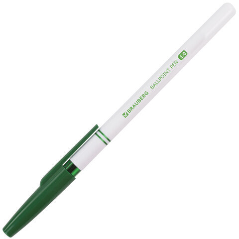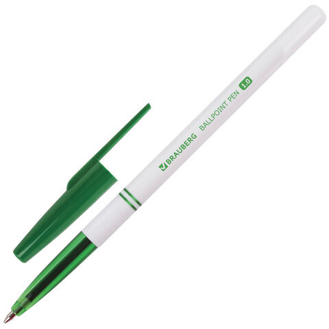 Ручка шариковая BRAUBERG "Офисная", ЗЕЛЕНАЯ, корпус белый, узел 1 мм, линия письма 0,5 мм, 141511