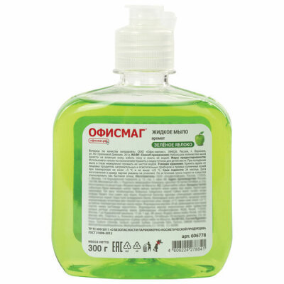 Жидкое мыло ОФИСМАГ "Зеленое яблоко" идеально подходит для использования в офисах, отелях, ресторанах и других общественных местах.