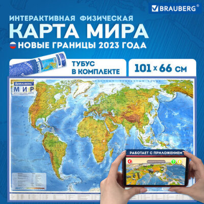Карта мира физическая 101х66 см, 1:29М, с ламинацией, интерактивная, в тубусе, BRAUBERG, 112378