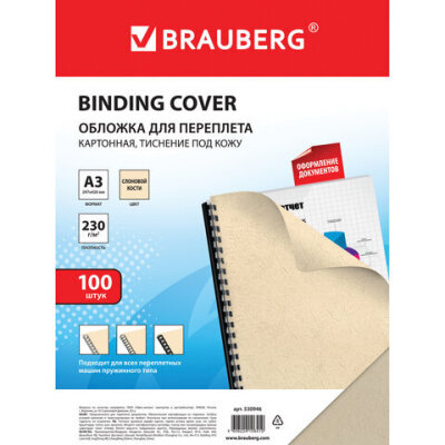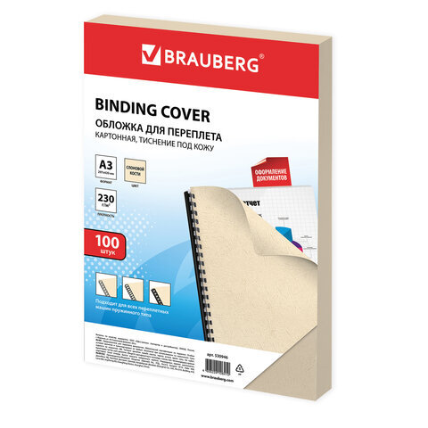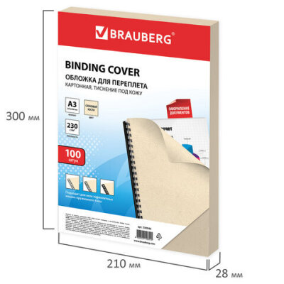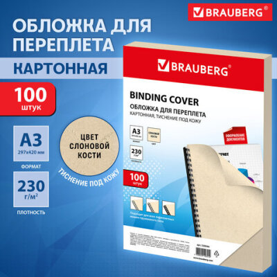 Обложки картонные для переплета БОЛЬШОЙ ФОРМАТ А3, КОМПЛЕКТ 100 шт., тиснение под кожу, 230 г/м2, слоновая кость, BRAUBERG, 530946