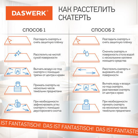 • Скатерть клеенка на стол DASWERK удобна и практична для многоразового использования. Скатерть на стол (пленка на стол прозрачная) незаменима дома, в офисе, в местах общественного питания, а также для мероприятий на открытом воздухе.