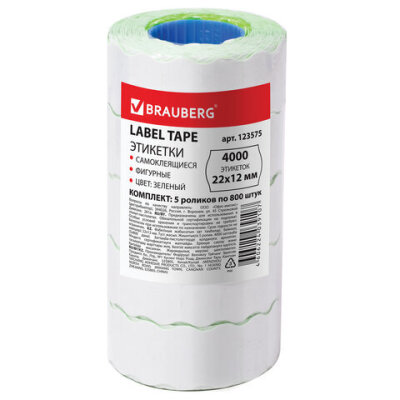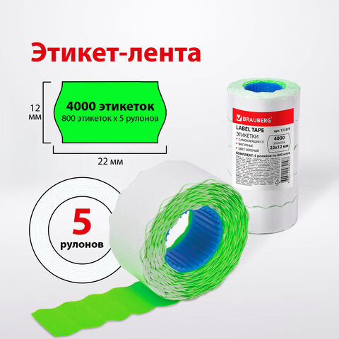 Этикет-лента 22х12 мм, волна, зеленая, комплект 5 рулонов по 800 шт., BRAUBERG, 123575