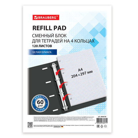Сменный блок к тетради на кольцах БОЛЬШОГО ФОРМАТА А4, 120 л., BRAUBERG, Белый, 404518