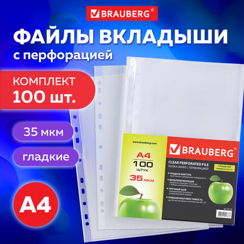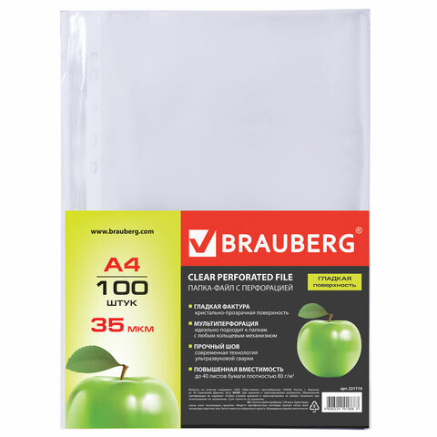 Папки-файлы перфорированные А4 BRAUBERG "PREMIUM", комплект 100 шт., гладкие, "Яблоко", 35 мкм, 221710