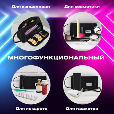 Пенал-косметичка BRAUBERG с ручкой, 1 откидная планка, полиэстер, 22x10х8 см, Black, 272339