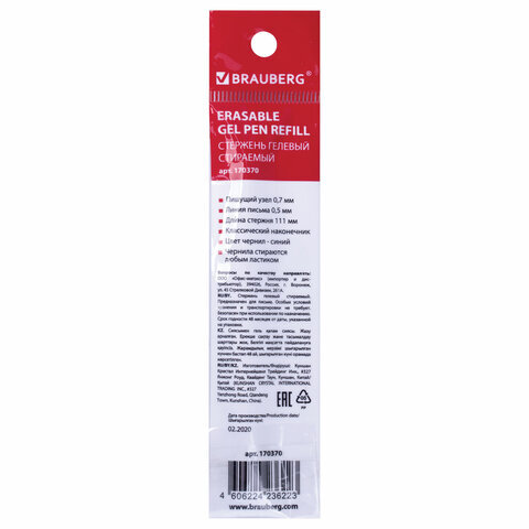 Стержень стираемый гелевый BRAUBERG 111 мм, СИНИЙ, евронаконечник, узел 0,7 мм, линия письма 0,5 мм, 170370