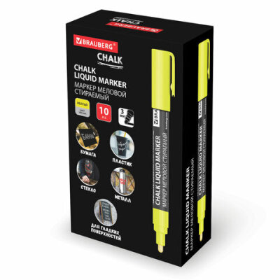 Маркер меловой CHALK LIQUID MARKER, ЖЕЛТЫЙ, 3 мм, стираемый, BRAUBERG "CHALK", 152590
