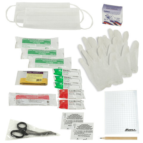 Автомобильная аптечка МИРАЛ содержит в себе все необходимое, чтобы остановить поверхностное кровотечение, обработать рану или место ушиба, наложить жгут, сделать искусственное дыхание.