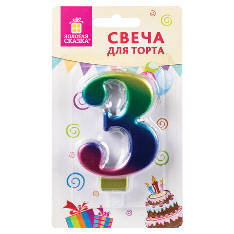 Свеча-цифра для торта "3" "Радужная", 9 см, ЗОЛОТАЯ СКАЗКА, с держателем, в блистере, 591436