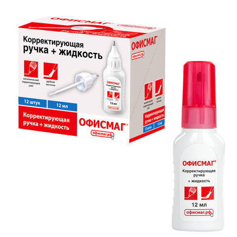 Ручка-корректор + корректирующая жидкость ОФИСМАГ, 12 мл, 2 в 1: металлический наконечник + кисточка, 225218