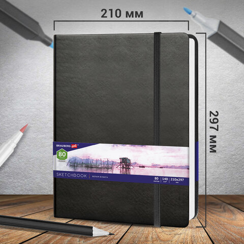Скетчбук, белая бумага 140 г/м2 210х297 мм, 80 л., КОЖЗАМ, резинка, BRAUBERG ART CLASSIC, черный, 113184