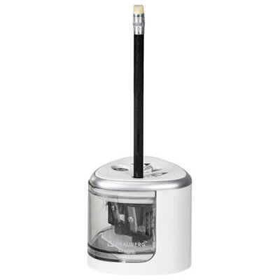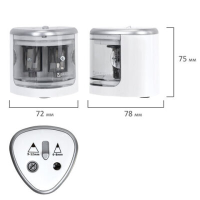 • Электрическая точилка BRAUBERG DUAL со съемным контейнером для сбора мусора и прямым лезвием работает от 4 батареек АА (в комплект не входят). Имеет два отверстия для затачивания деревянных и пластиковых карандашей диаметром 6-8 мм и 9-12 мм.