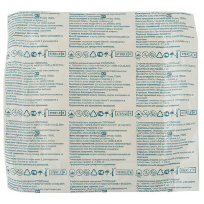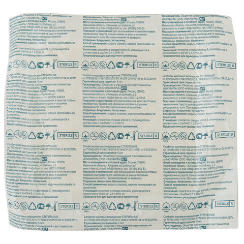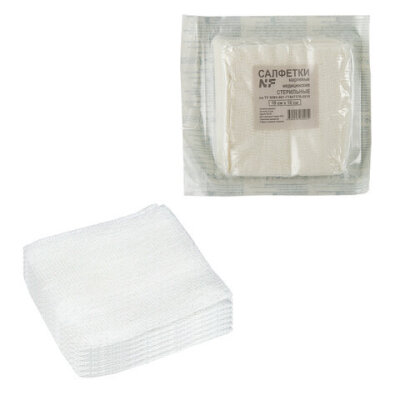 Стерильные марлевые салфетки изготовлены из отбеленной хлопчатобумажной медицинской марли плотностью 32 г/м2 путем сложения в 8 слоев. Салфетки сложены индивидуально и упакованы по 10 штук.