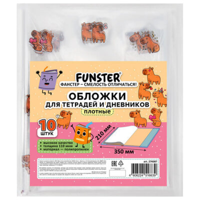 Обложки "CAPYBARAS" для тетрадей и дневников, КОМПЛЕКТ 10 шт., ПЛОТНЫЕ, 210х350 мм, 110 мкм, FUNSTER (ФАНСТЕР), 274087