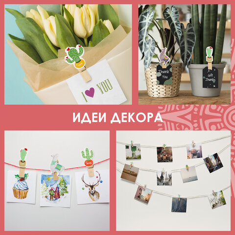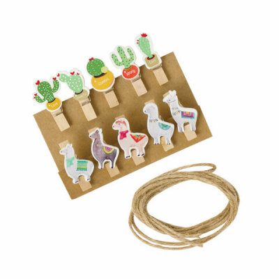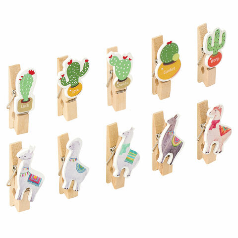 Прищепки декоративные "Ламы и кактусы", 10 штук, 3,5 см, ассорти, со шпагатом, ОСТРОВ СОКРОВИЩ, 662670