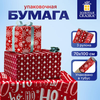 Бумага упаковочная новогодняя НАБОР 3 шт., "Red Collection", 70х100 см, 3 дизайна, ЗОЛОТАЯ СКАЗКА, 592057