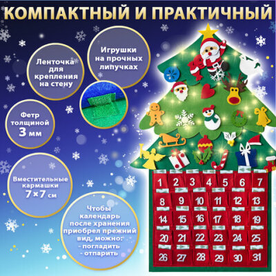 Адвент-календарь из фетра "ЗОЛОТАЯ СКАЗКА" – это оригинальное новогоднее украшение интерьера и увлекательная развивающая игра для детей по методике Монтессори.