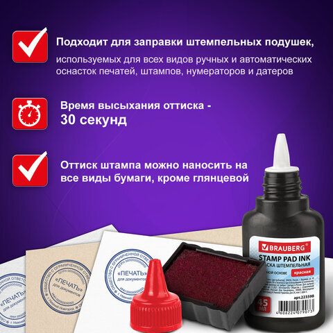 Штемпельная краска BRAUBERG предназначена для заправки штемпельных подушек, используемых для всех видов ручных и автоматических оснасток печатей, штампов, нумераторов и датеров.