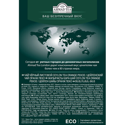 Крупнолистовой цейлонский чай, обладает насыщенным, мягким вкусом, ярким оранжевым цветом, богатым чайным ароматом. Хорошо сочетается с лимоном. Стандарт Orange Pekoe характеризуется крупным, однородным листом с высоким содержанием ароматических масел.