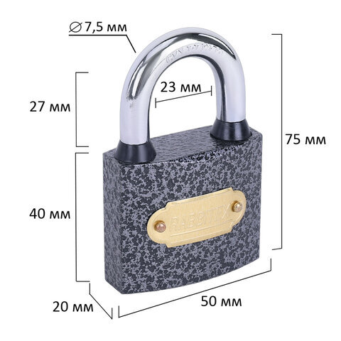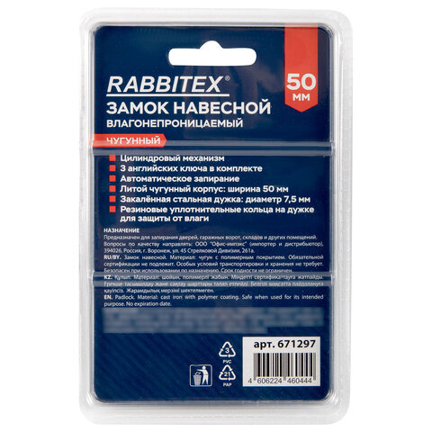 Замок навесной чугунный "Влагонепроницаемый", ширина 50 мм, полимерное покрытие, английский, 3 ключа, RABBITEX (РАББИТЕКС), 671297