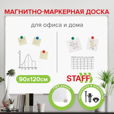 Доска магнитно-маркерная 90х120 см, ПВХ рамка, ГАРАНТИЯ 10 ЛЕТ, РОССИЯ, STAFF, 236159