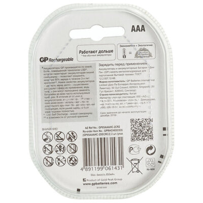 Батарейки аккумуляторные Ni-Mh мизинчиковые КОМПЛЕКТ 2 шт., AAA (HR03) 850 mAh, GP, 85AAAHC-2DECRC2