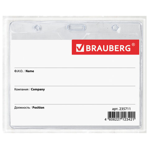 Бейдж горизонтальный (60х90 мм), с клипсой и булавкой, мягкий, BRAUBERG, 235711