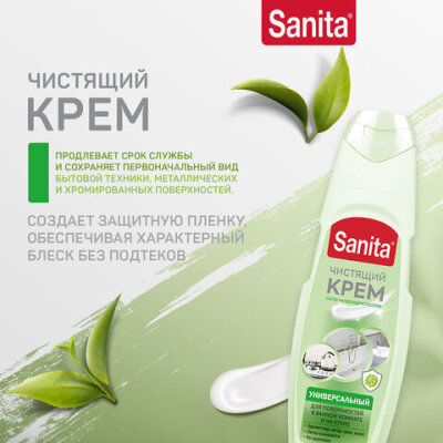 Чистящее средство универсальное крем SANITA "Зеленый чай и лайм" для очистки кухонных поверхностей и ванной комнаты. Не царапает и не повреждает поверхности. Легко смывается, не оставляя разводов. Может применяться для ежедневной уборки.