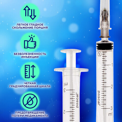 Шприц 3-х компонентный PASCAL, 3 мл, КОМПЛЕКТ 10 шт., в коробке, игла 0,7х40 - 22G, 120307